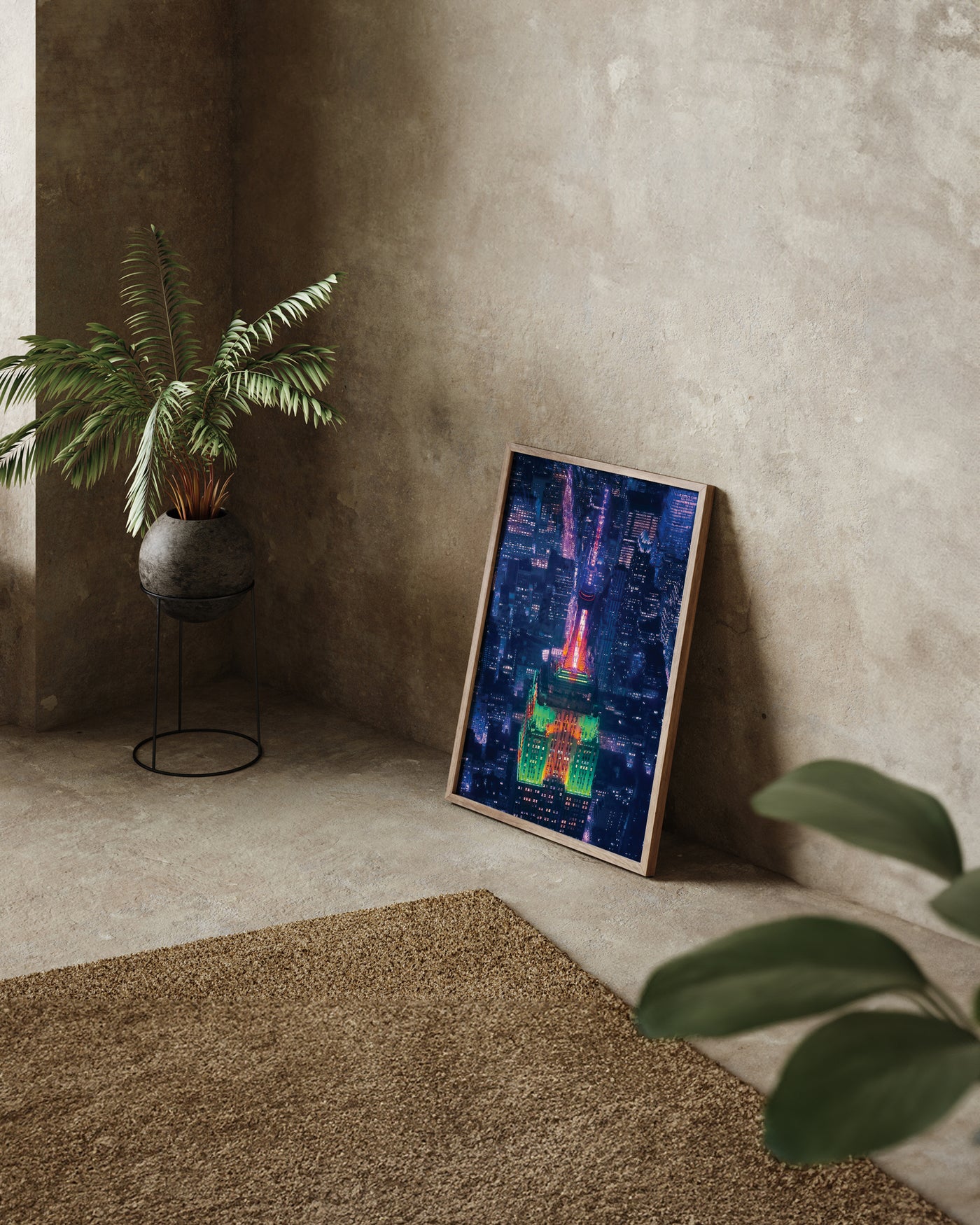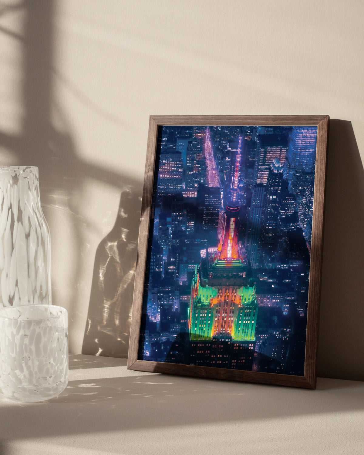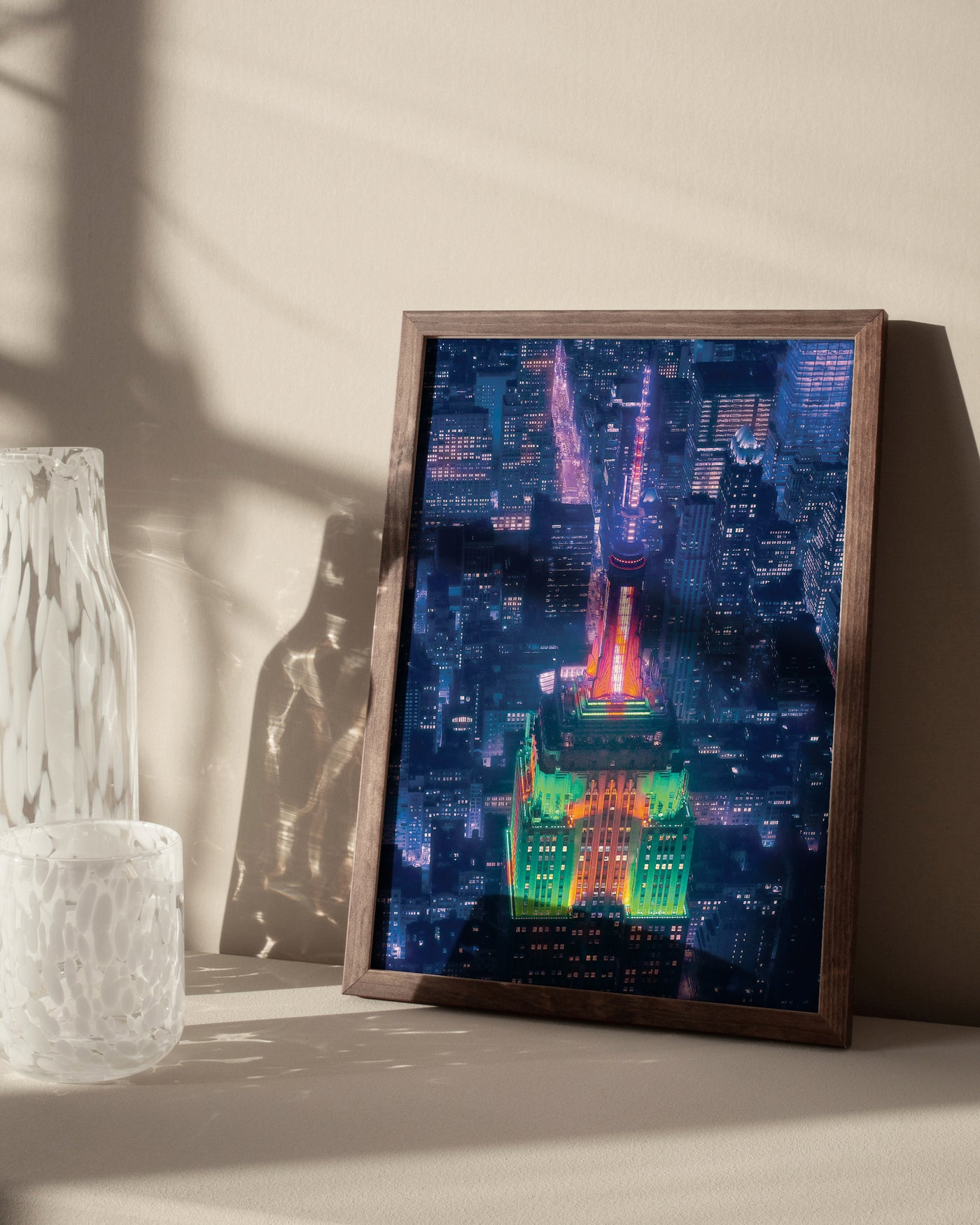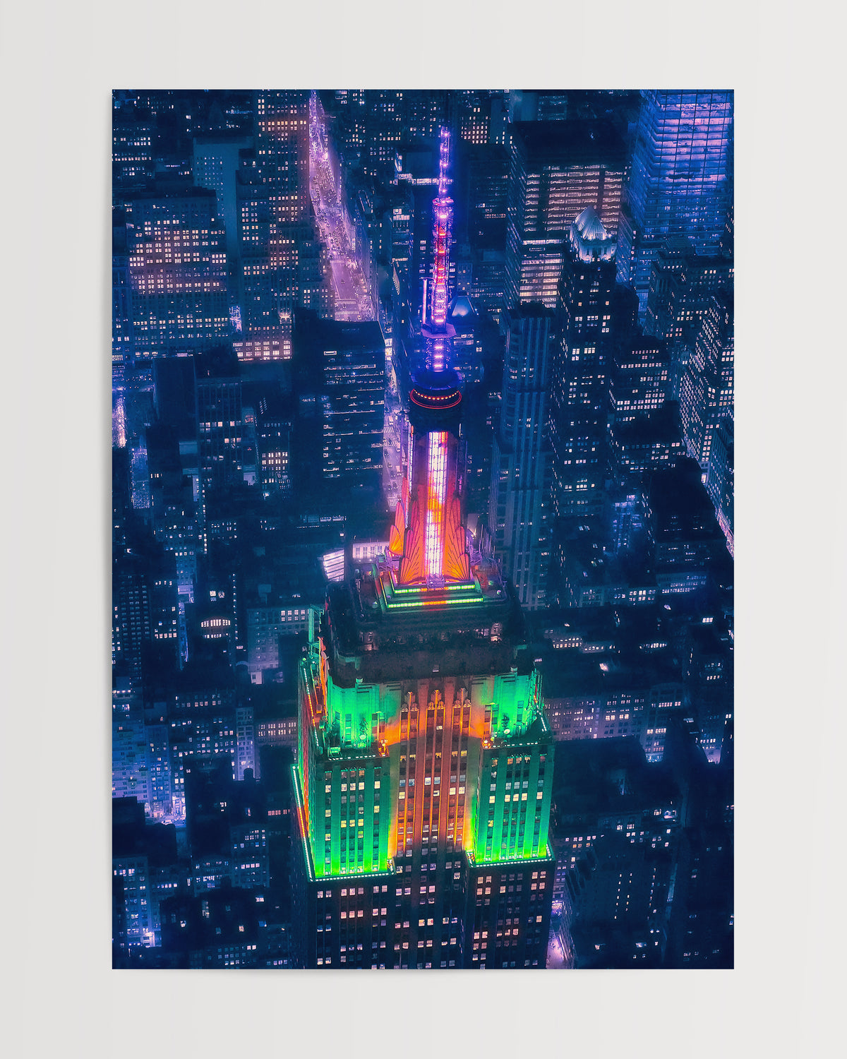 Une vue nocturne époustouflante de l'Empire State Building. Les lumières colorées contre le paysage urbain créent une scène magique qui apportera la vitalité de NYC dans votre maison. 🏙️✨ #VilleDesLumières #ÉléganceUrbaine #ThePosterSquare